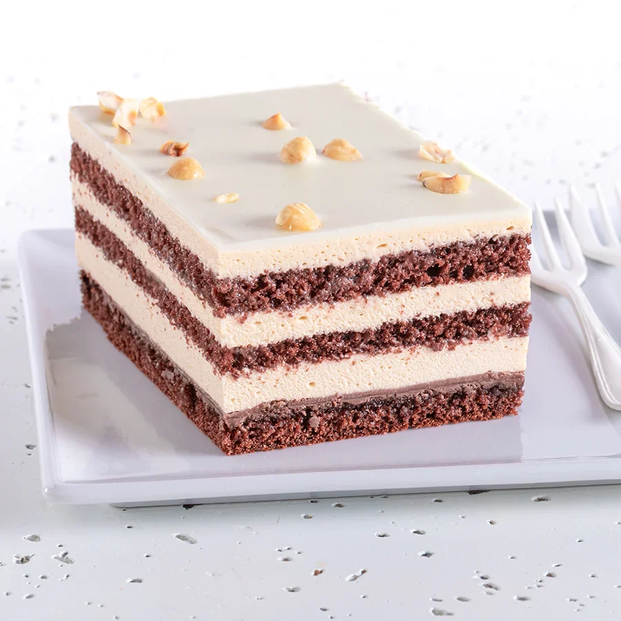 Puszyste ciasto kakaowe przełożone chrupką orzechową oraz kremem na bazie serka mascarpone i śmietany z nutą orzecha laskowego.